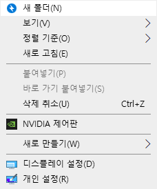 우클릭을 하시면 새폴더, 보기, 정렬 기준, 새로고침, 삭제 취소, nvidia 제어판, 새로 만들기가 보일 것입니다.