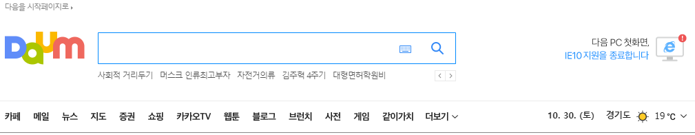 다음 홈페이지 상단을 보시면 카페, 메일, 뉴스, 지도 등의 메뉴들이 보일 것입니다.