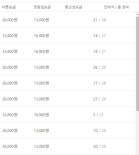 그리고 시간표 오른쪽 편을 보시면 어른 요금, 초등생 요금을 확인할 수 있고 맨 오른쪽에서는 잔여석 총 좌석을 확인하실 수 있을 것입니다.