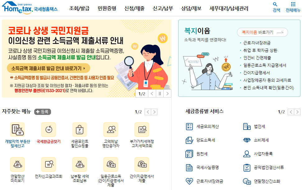 그리고 아래쪽에는 자주찾는 메뉴와 세금 종류별 서비스가 보입니다. 그리고 현재 코로나 상생 국민지원금 이의 신청 관련 소득금액 제출 서류를 할 수 있는 것으로 보입니다.