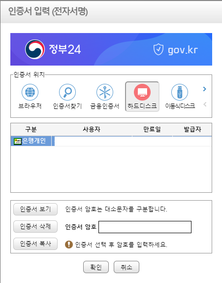 만약에 공인인증서 등록을 할때 공인인증서가 보이지가 않는다면 공인인증서를 미리 갱신 또는 복사 해놓으신 후 다시 하시기 바랍니다.