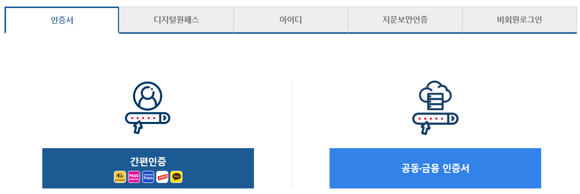로그인 버튼을 클릭했을 때 나오는 화면이며 오른쪽에 공동 금융인증서를 클릭하신 후 공인인증서 인증만 하시면 로그인을 할 수 있습니다.