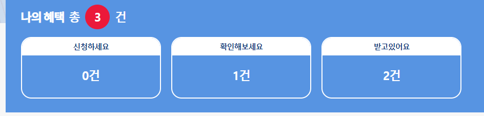 혜택을 현재 받고 있는 것과 받을 수 있는지 확인해야하는 것, 신청할 수 있는 것 3가지가 검색이 되는데 혹시나 놓치고 있던 혜택들이 있는지 홈페이지에서 확인을 하실 수 있습니다.