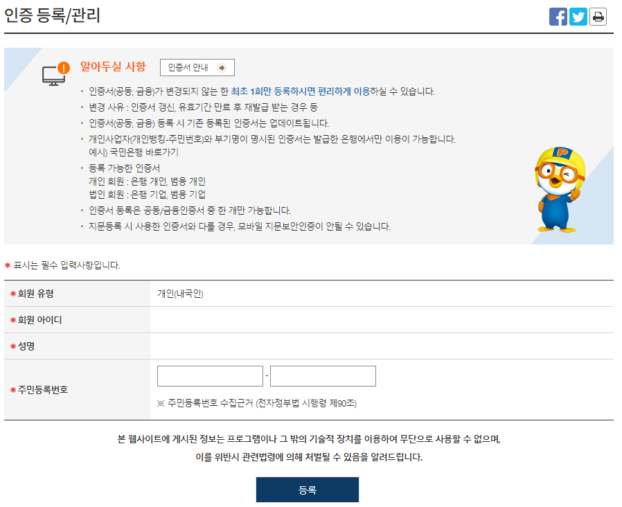 공인인증서 등록을 하려면 주민등록번호를 입력하여야 하며 입력 후 PC에 설치되어 있는 공인인증서를 이용하여 등록을 하시면 됩니다.