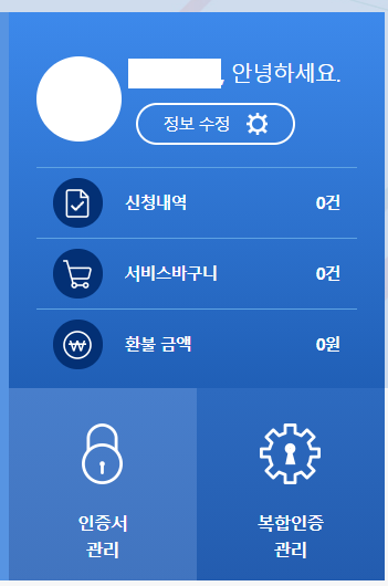 MY GOV를 클릭하셔서 오른쪽을 보시면 신청내역, 바구니, 환불 금액, 인증서 관리, 복합인증 관리가 보일 것입니다.