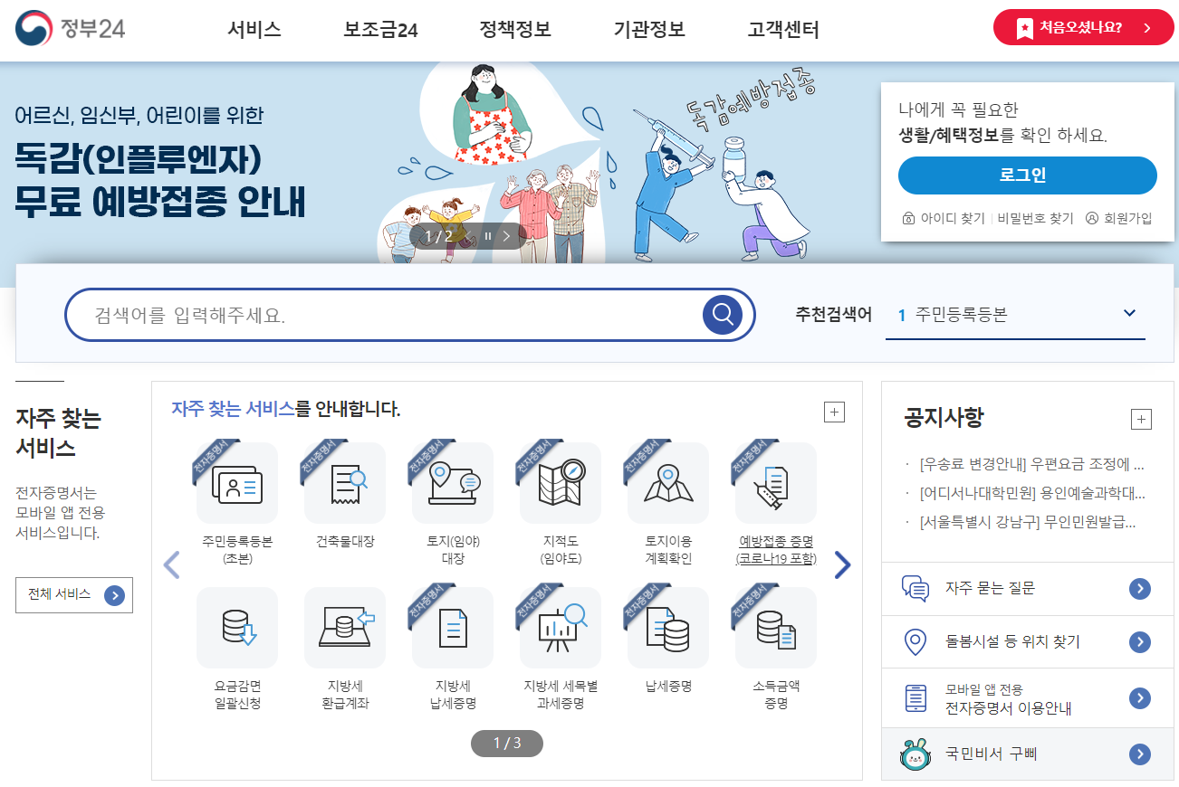 정부24시 홈페이지에 처음 접속하시면 나오는 화면입니다.