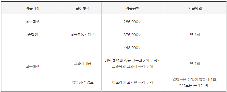 교육급여의 수급자격은 중위소득의 50%이며 교육활동지원비 기준으로 초등학생은 지급급액이 286,000원, 중학생은 376,000원 고등학생은 448,000원이며 연 1회, 고등학생은 교육활동지원비뿐만아니라 교과서 대금 연 1회, 입학금, 수업료, 1회, 수업료는 분기별로 지급받을 수 있습니다.