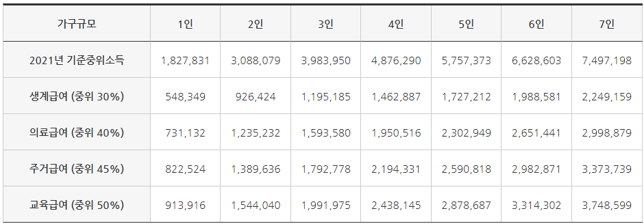 2021년 기준 중위소득은 1인 1,827,831원, 2인 3,088,079원, 3인 3,983,850원, 4인 4,876,290원, 5인 5,757,373원, 6인 6,628,603원, 7인 7,497,198원입니다. 기준준위소득으로 기초생활수급자 소득을 계산하는데 생계급여는 중위 소득의 30%, 의료급여는 중위소득의 40%, 주거급여는 중위소득의 45%, 교육급여는 중위소득의 50%입니다. 가구별로 계산을 해보면 생계급여는 1인 548,349원, 2인 926,424원, 3인1,195,185원, 4인 1,462,887원, 5인 1,727,212원 등입니다. 나머지 급여는 위표를 읽어보시는게 좋을 것 같습니다.