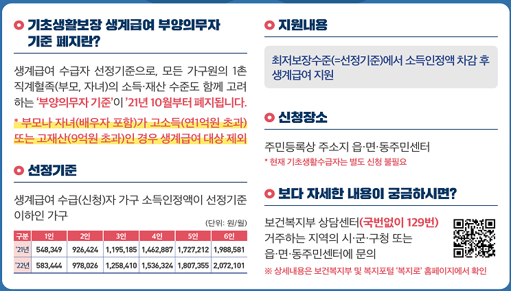 기존에는 주거급여와 교육급여만 부양의무자 기준이 적용되지 않았는데 21년 10월부로 생계급여도 부양의무자 기준이 폐지되었습니다. 혹시나 부양의무자로 인해서 생계급여를 수급받지 못하셨던 분들이 있다면 한번 신청을 해보시기 바랍니다.