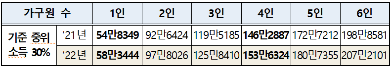 다시한번 설명드리면 22년 기준으로 1인 가구는 중위소득이 583,444원, 2인 978,026원, 3인 1,258,410원, 4인 1,536,324원, 5인 1,807,355원, 6인 2,072,101원입니다.