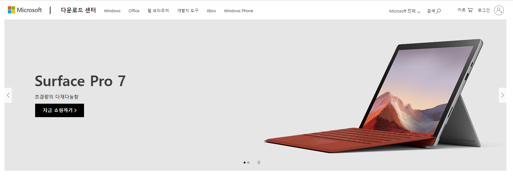 마이크로소프트 다운로드센터 홈페이지 메인 화면의 모습입니다.