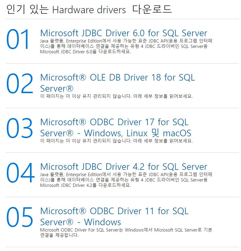 첫번째에는 Microsoft JDBC Driver 6.0 for SQL Server, 두번째에는 Microsoft JDBC Driver 4.2 for SQL Server 드라이버가 보입니다. 필요한 드라이버가 있다면 다운로드 받으시면 될 것 같습니다.