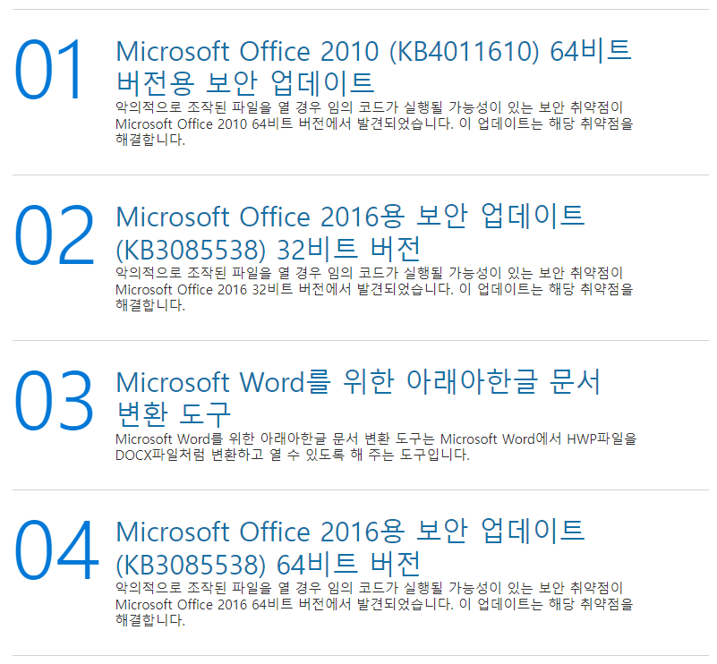 마지막으로 office 를 클릭하시면 2010 64bit 버전용 보안 업데이트, 2016용 32비트 버전, 한글 문서 변환도구, 2016용 64비트 버전 등을 다운로드 받으실 수 있습니다.