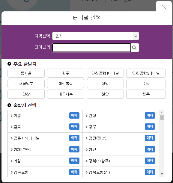 클릭을 하시면 출발지 선택, 도착지 선택, 출발일, 출발시간이 보일 것입니다.