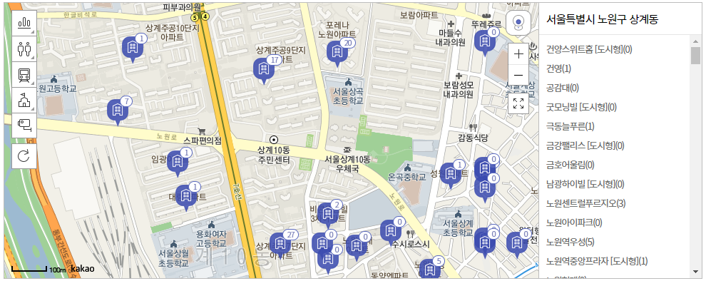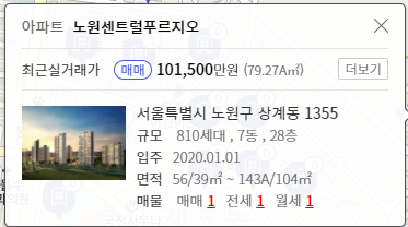 숫자 옆에 있는 것은 아파트 매물의 수를 의미하는 것인데 저는 상계동을 한번 클릭해보겠습니다.