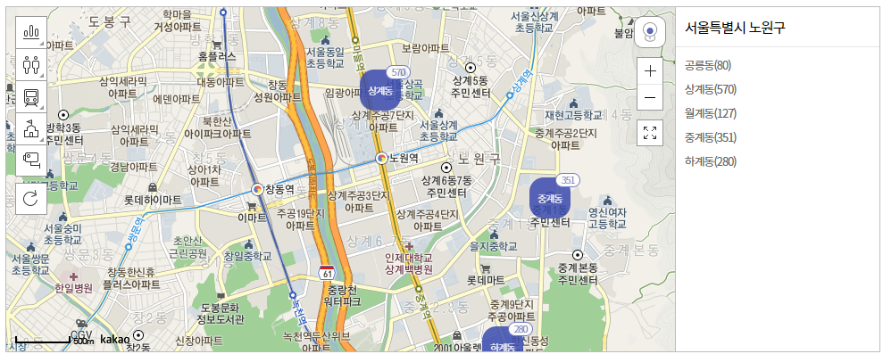 공릉동, 상계동, 월계동, 중계동, 하계동이 나오고 동 옆을 보시면 숫자가 보일 것입니다.