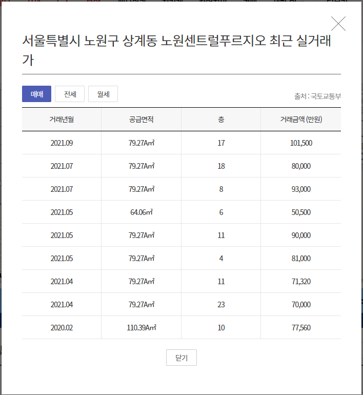 보시면 매매, 전세, 월세 버튼이 있고 거래년월 별로 공급면적, 층, 거래금액이 확인 됩니다.