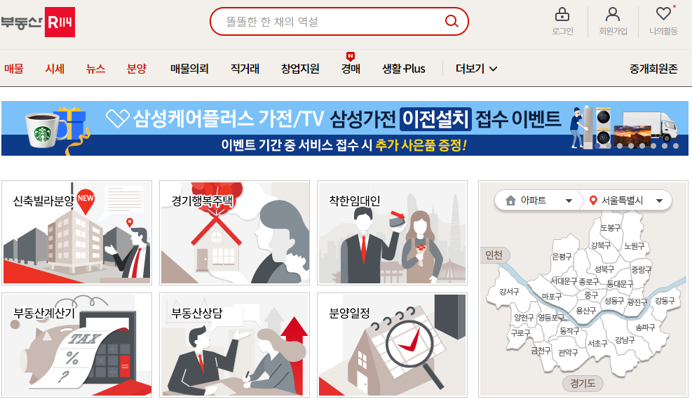 상단 메뉴들을 보시면 매물, 시세, 뉴스 등이 보일 것입니다.