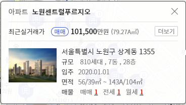 숫자 옆에 있는 것은 아파트 매물의 수를 의미하는 것인데 저는 상계동을 한번 클릭해보겠습니다.