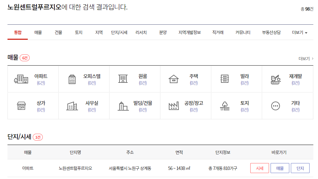 결과창 아래를 보시면 단지/시세가 보이실텐데 오른쪽 끝을 보시면 시세 버튼이 있습니다.